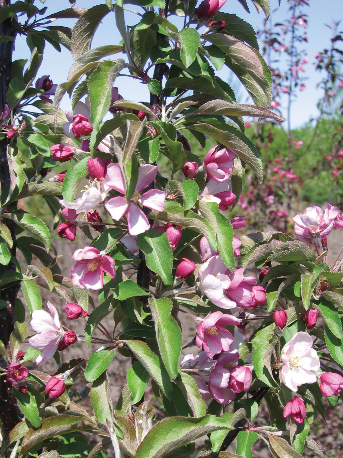 Slow growing crabapple that has a columnar tree form. Pink flowers emerge in spring followed by red fruit. Disease free foliage and dwarf, columnar growth habit...
