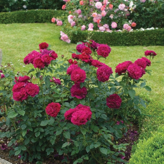Beautiful, deep crimson rosettes with a delightful fruity fragrance. An exceptional variety which flowers freely and repeats well. Compact, bushy growth.