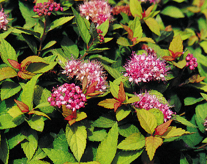 Gold leafed, dwarf Spirea with bronze tips and flowers. Makes an excellent border or ground cover.